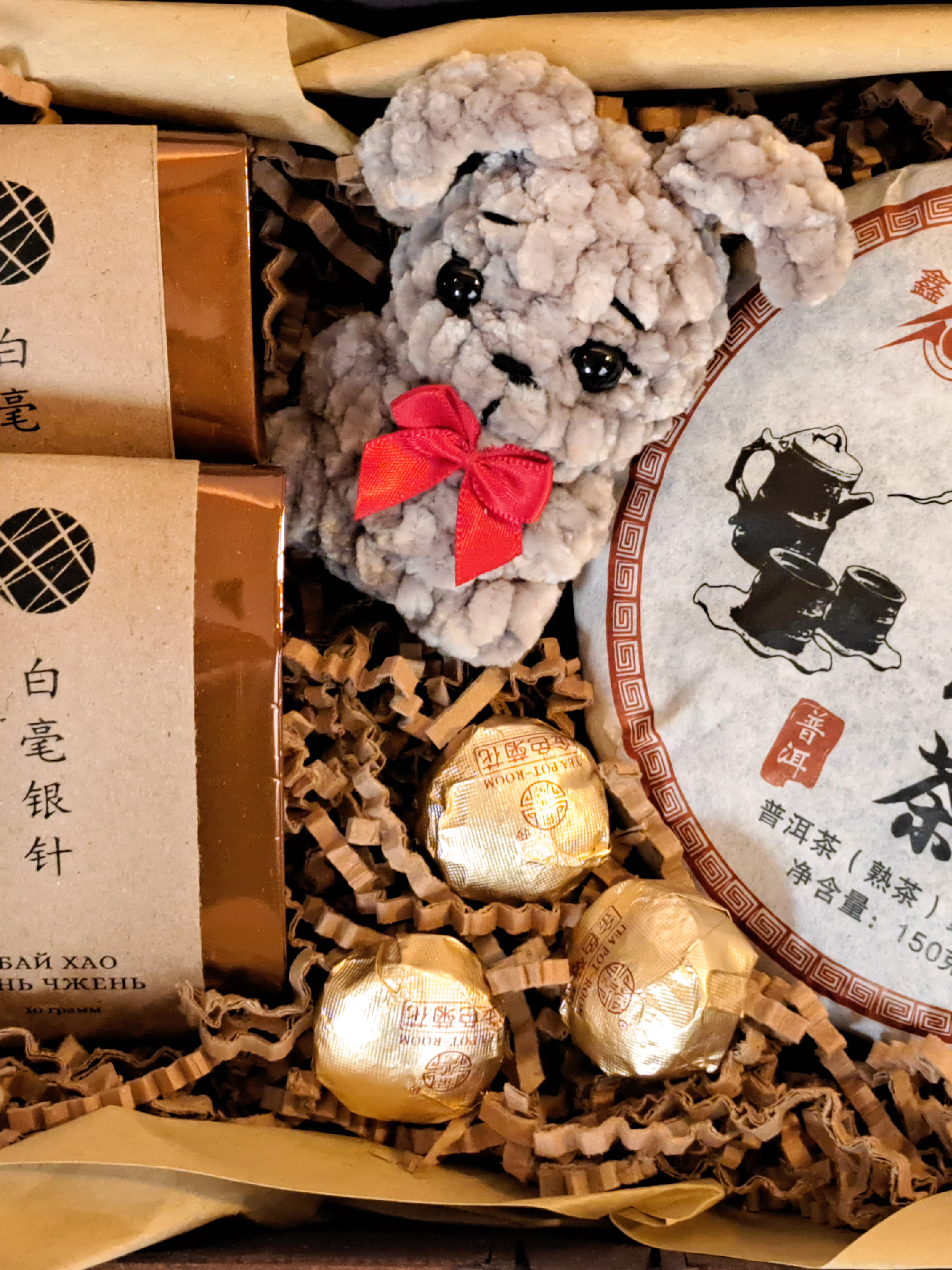 Подарочный набор белого чая и шу пуэр с вязаной игрушкой